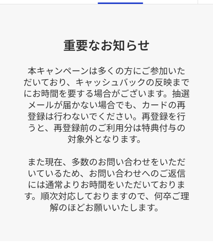 - 再登録は絶対にしないで!: メールが来ないからといってカードを解除・再登録すると、それまでの利用分が特典対象外になってしまいます。