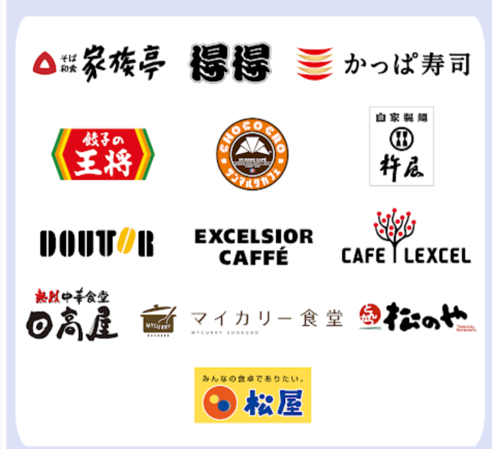 - 外食・居酒屋系: 餃子の王将、日高屋、かっぱ寿司、杵屋、家族亭、得得