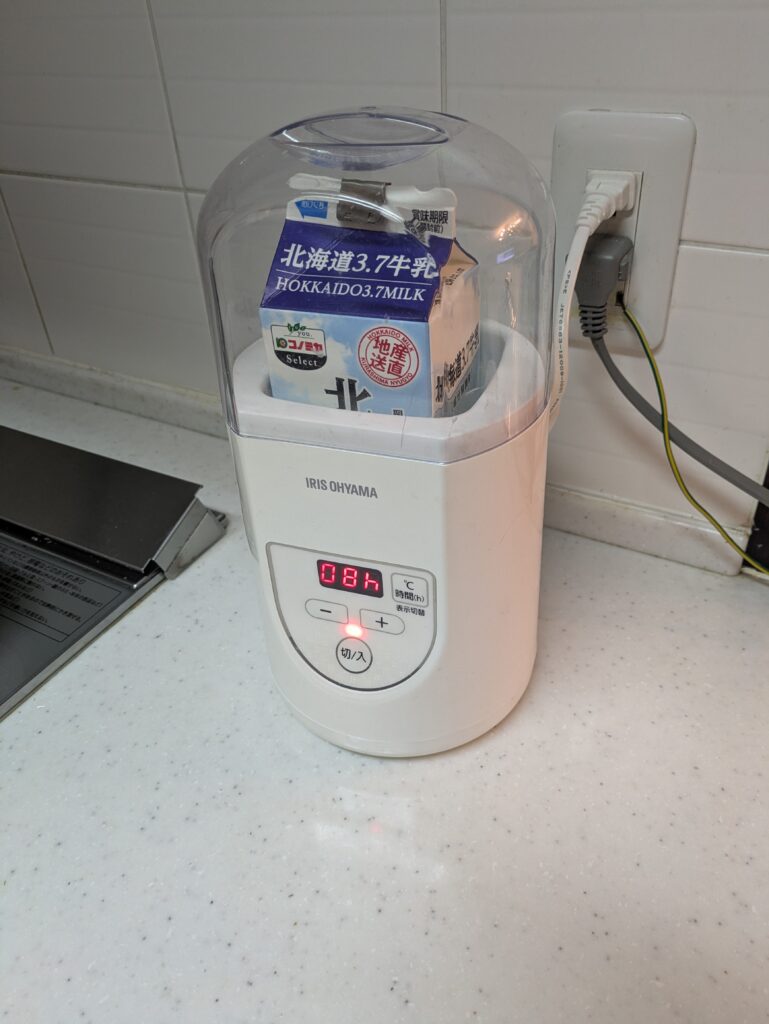 キッチンに馴染むアイリスオーヤマのヨーグルトメーカー。牛乳パックをそのままセットできるのが最高に楽です。