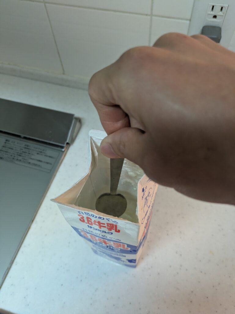 そこで多くの人がやるのが、**「牛乳パックを途中で半分に切る」**という方法でしょう。これですくいやすくはなります。