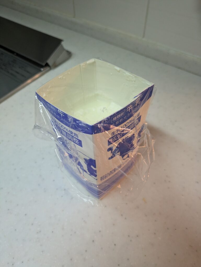 - 半分に切った牛乳パックに、軽くラップを乗せる。