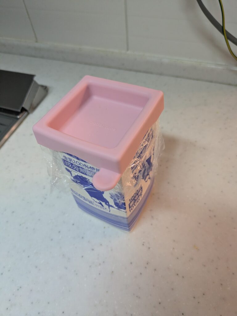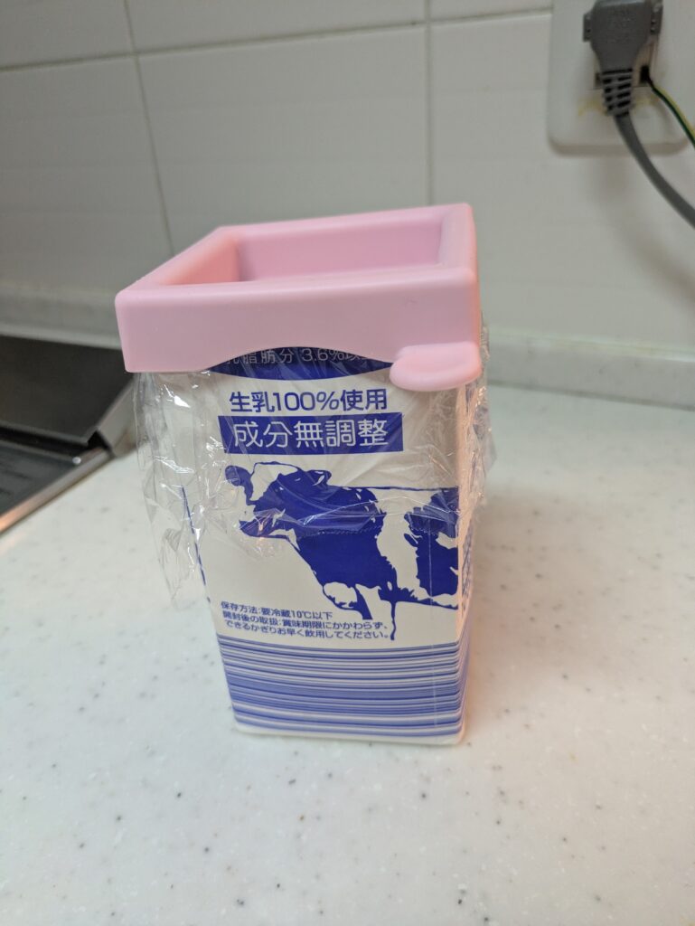 ただのシリコンのキャップに見えますが、これが牛乳パック(1Lサイズ)の口に気持ちいいくらい**「シンデレラフィット」**するんです。