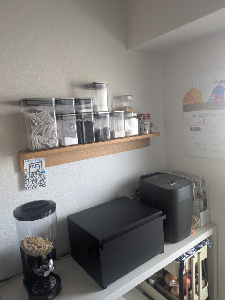 ホームベーカリーでパンを焼いたり、こだわりの朝食を楽しんだりしていると、どうしても増えてしまうのが**「調味料やストックの置き場所」**。