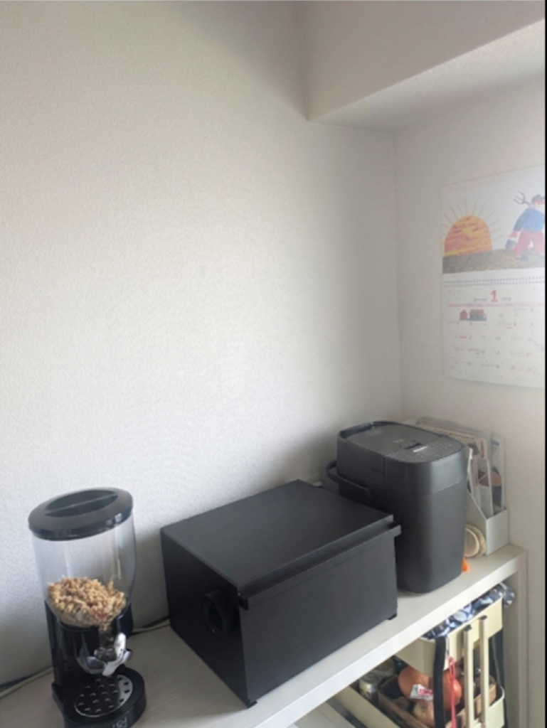 これまではカウンターに直置きしていたこれらのボトルが「浮いた」ことで、下のスペースに余裕が。大活躍中のホームベーカリーやシリアルサーバー周りも広々として、作業効率が爆上がりです。